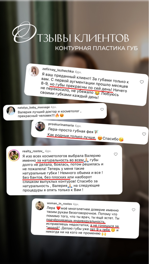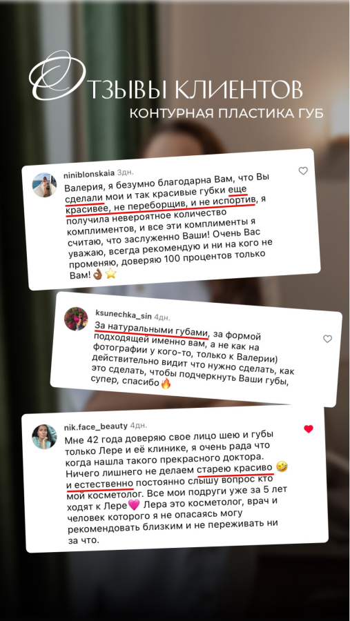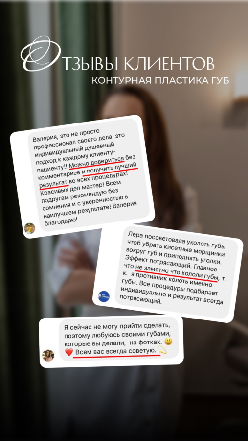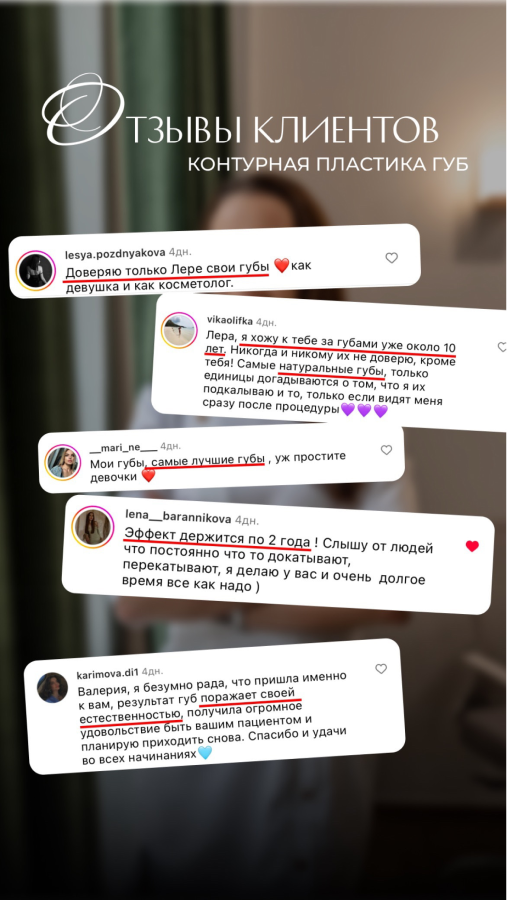 Те, кто хоть раз ощутил, что такое идеальные губы, будут приходить к вам 2−3 раза в год. И вы будете получать только такие отзывы